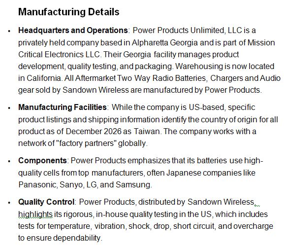 Power Products private labels all replacement batteries, chargers and audio gear for Sandown Wireless.